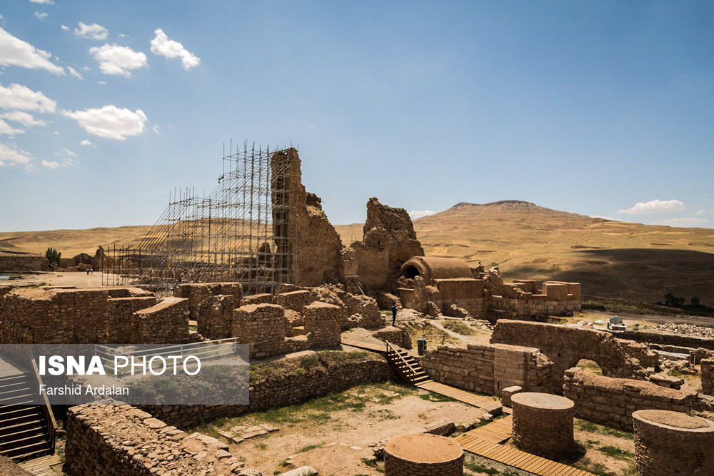 مجموعه تاریخی «تخت سلیمان» به مساحت ۱۲۴ هزار مترمربع که در ادوار مختلف محل سکونت مادها، اشکانیان، ساسانیان و مغولها بوده در استان آذربایجان غربی قرار دارد و به روایتی محل تولد زرتشت پیامبر میباشد. قلعه تاریخی تخت سلیمان بازمانده از دوره ساسانیان با بخشهای مختلفی همچون آتشکده آذر گشسب به عنوان یکی از مهمترین آتشکده های دوره ساسانی، آتشکده شاهی و جنگ آوران، ایوان خسرو، معبد آناهیتا و چندین آتشکده کوچک و دروازهها و دیوارهای مستحکم از بناهای مهم تاریخی ایران و جهان به شمار میرود. تمام آثار آن درون یک حصار و دیوار بیضی شکل بنیان گرفته که دور تا دور آن دشتی گسترده است. حصار بیرونی از سنگ های لاشه ای به ابعاد مختلف به ضخامت ۵ متر و ارتفاع ۱۴ متر و محیط بیرونی ۱۲۰۰ متر بنا شده است. لایه بیرونی حصار با سنگ های تراشدار نماسازی شده و دارای ۳۸ برج دفاعی مخروطی شکل است.تخت سلیمان در حمله امپراطور رومیان به ایران که در سال ۶۲۴ میلادی اتفاق افتاد ویران شد.